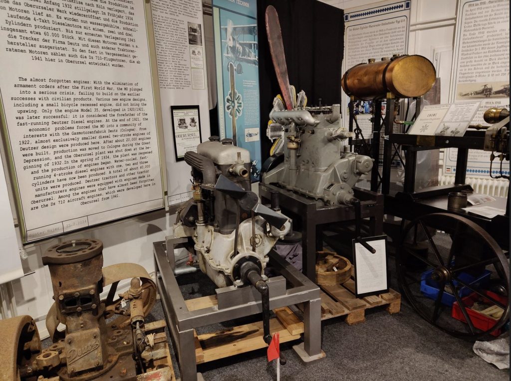 Ein besonderer Programmpunkt war die Führung durch das Werksmuseum der Motorenfabrik Oberursel. Die Ausstellung beeindruckt nicht nur durch ihre Größe, sondern vor allem durch die Authentizität der Exponate. Besonders hervorzuheben ist der Siebenzylinder-Umlaufmotor Typ U0. Dieser Motortyp war damals aufgrund seiner Laufruhe und seines geringen Gewichts besonders beliebt. Charakteristisch ist die rotierende Bauweise, bei der sich Zylinder und Gehäuse um eine feste Kurbelwelle drehen.